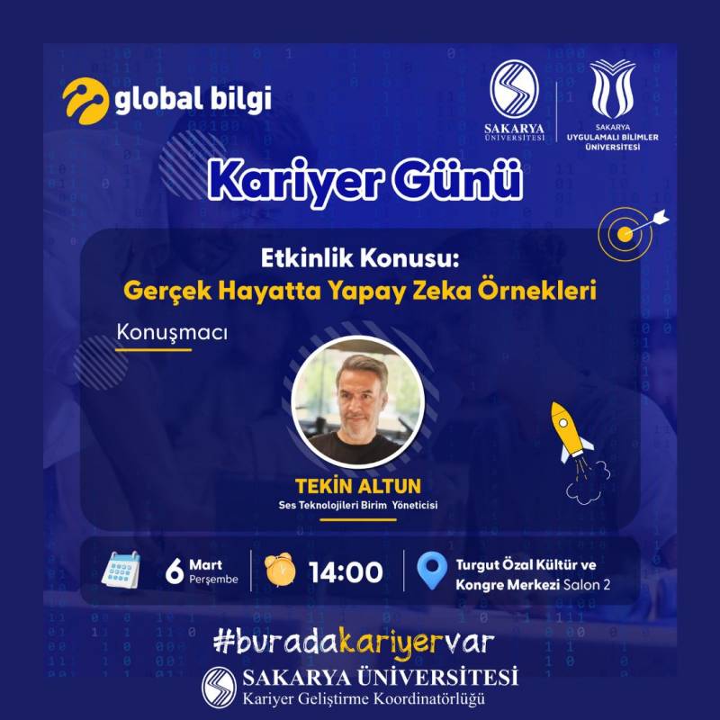 SAU Kariyet Geliştirme Koordinatörlüğü, Bahar döneminin ilk etkinliği ile yeniden sizlerle. 6 Mart 2025 Perşembe günü saat 14.00'da Kültür ve Kongre Merkezi Salon 2'de Turkcell Global Bilgi ile gerçekleştirilecek olan "Gerçek Hayatta Yapay Zeka Örnekleri"' konulu etkinliğimizi sizlerle paylaşmaktan memnuniyet duyarız.
