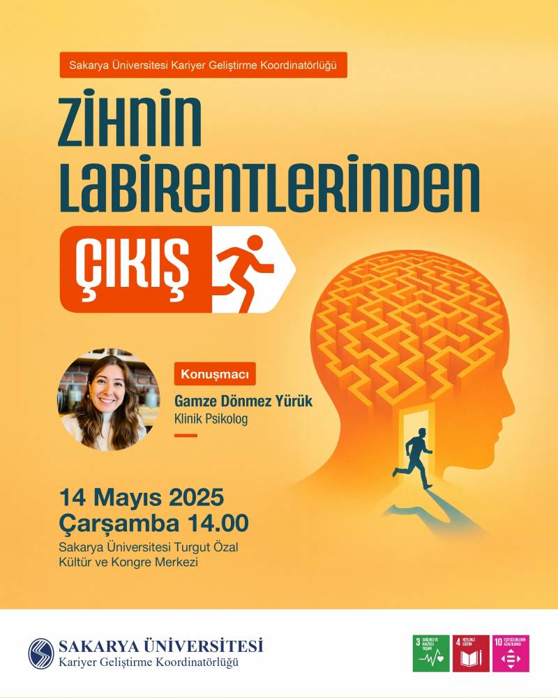SAÜ KARİYER GELİŞTİRME KOORDİNATÖRLÜĞÜ tarafından 14 Mayıs 2025 Çarşamba günü saat 14.00'te Kültür ve Kongre Merkezi Fuat Sezgin Salonunda düzenlenecek olan "Zihnin Labirentlerinden Çıkış" adlı etkinliği sizlerle paylaşmaktan memnuniyet duyarız.