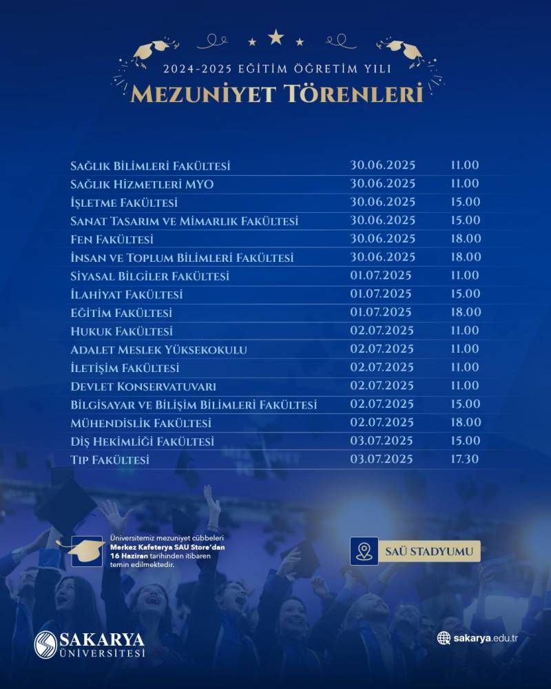 Sakarya Üniversitesi Siyasal Bilgiler Fakültesi 2025 yılı mezuniyet töreni, 1 Temmuz 2025 Salı günü saat 11.00’de Sakarya Üniversitesi Stadyumu’nda gerçekleştirilecektir.