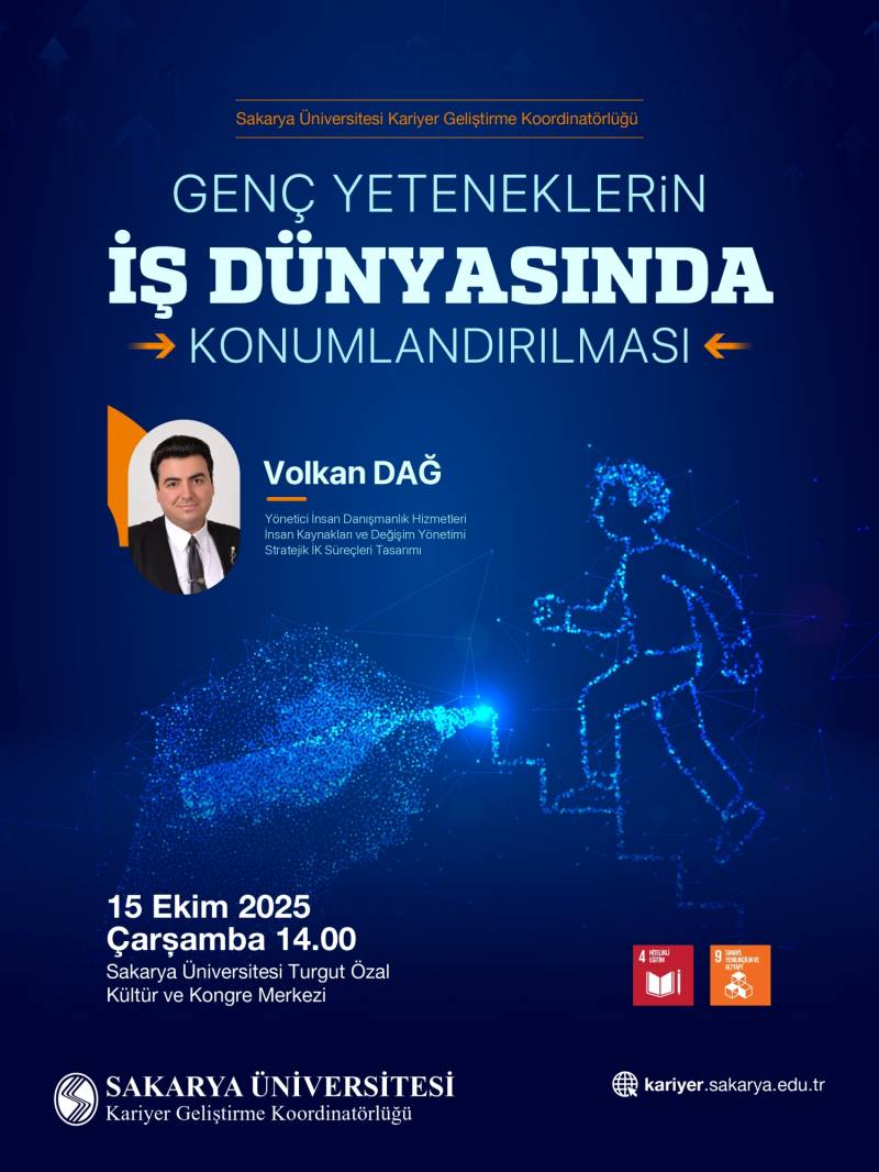 SAÜ KARİYER GELİŞTİRME KOORDİNATÖRLÜĞÜ tarafından organize edilen ve 15 Ekim 2025 tarihinde 14.00'te Turgut Özal Kültür ve Kongre Merkezi Fuat Sezgin Salonunda gerçekleştirilecek olan "Genç Yeteneklerin İş Dünyasında Konumlandırılması" adlı etkinliği sizlerle paylaşmaktan memnuniyet duyarız.