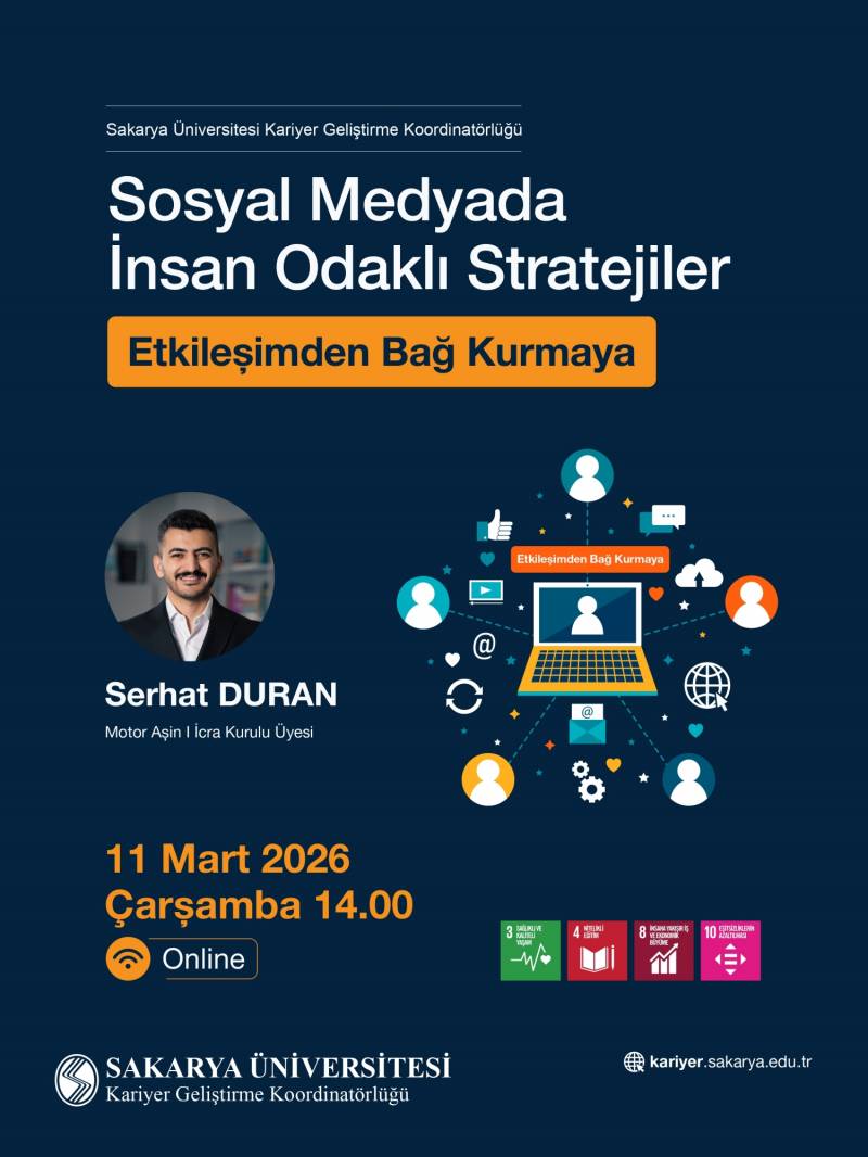 Sakarya Üniversitesi Kariyer Geliştirme Koordinatörlüğü olarak Motor Aşin İcra Kurulu Üyesi Serhat DURAN’ı ağırlıyoruz. Sosyal medyanın teknik detaylarından sıyrılıp "Etkileşimden Bağ Kurmaya" uzanan o kritik yolculuğa birlikte çıkacağız. Bu Etkinlikte Neler Konuşulacak? - Sosyal medyada insan odaklı stratejiler geliştirmek